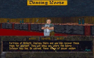 Talin now has his first artifact quest. When inquiring about general rumors, you sometimes will be pointed to a tavern in your current city to receive information on a specific artifact. Which artifact is generated for the quest is entirely random. If you like, you can cycle through rumors until you are eventually pointed to the one you want. At the tavern, you are given the opportunity to purchase information on a dungeon where the map to the artifact is located, which will then point you to a second dungeon to find the artifact itself. All artifact quests in Arena follow this format.