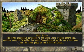 You enter Elden Grove, chilled by the mists that lend perpetual gloom to this melancholy place. You can hear things shuffling through the overgrowth, and distant growling and moaning that does not sound human at all…